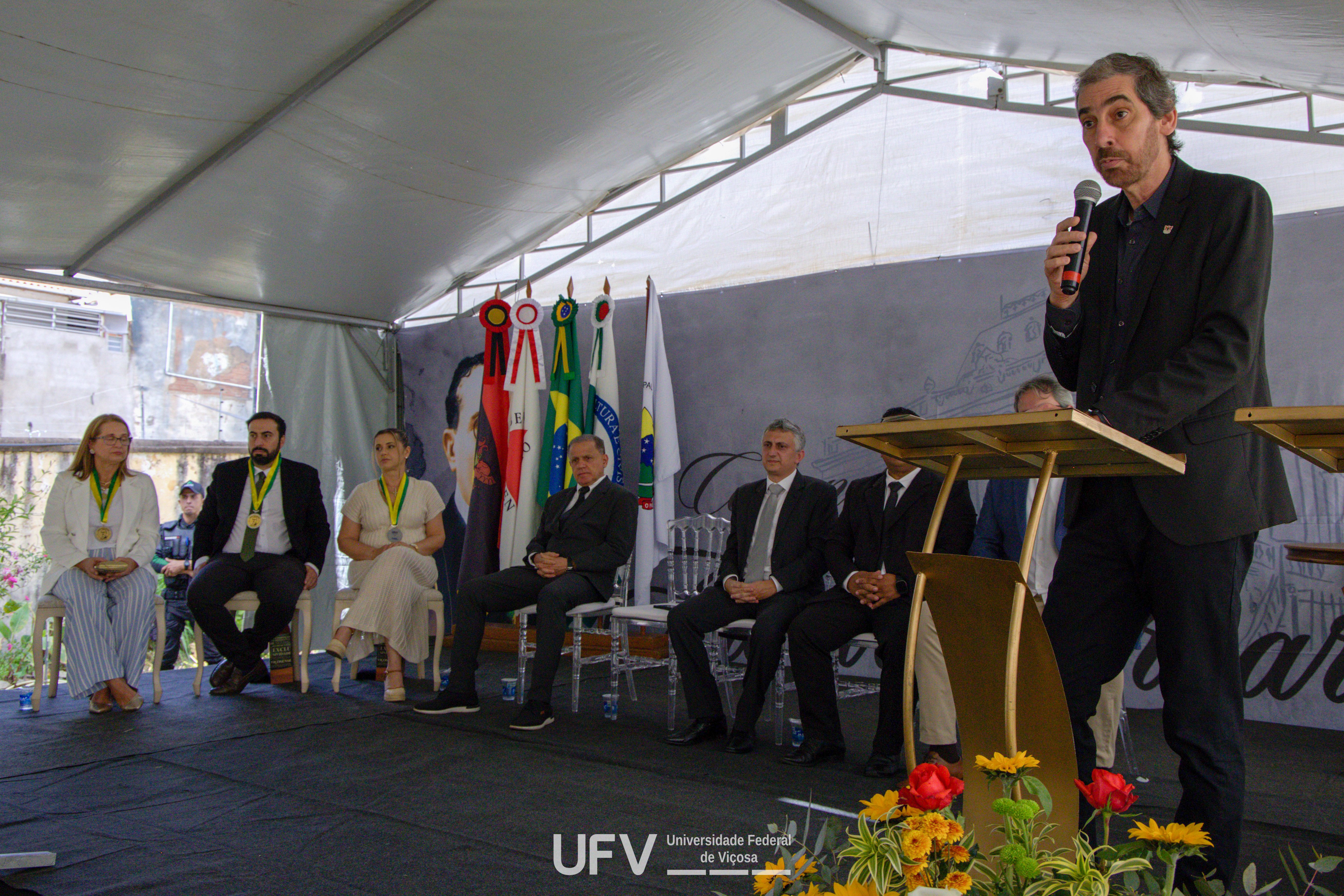 Representando a UFV na cerimônia, o reitor Demetrius David da Silva - agraciado com a comenda em 2022 - destacou o quanto as parcerias da Universidade com a cidade de Viçosa são importantes para ambas, citando, como exemplo, o trabalho intenso dos pesquisadores da UFV que ajudaram na testagem da covid-19. Ele lembrou que a relação de confiança do município na ciência, durante a gestão do prefeito Ângelo Chequer, contribuiu para que Viçosa figurasse entre as cidades com menor número de mortes pela doença. “A UFV tinha seis dos 19 laboratórios credenciados em todo o Estado de Minas para testagem do vírus, o que evitou o colapso no sistema de saúde, salvando vidas”, disse o reitor, parabenizando a Casa do Empresário pela escolha dos novos comendadores.