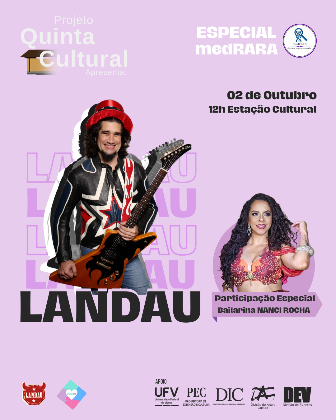 Esta semana, o Projeto Quinta Cultural terá uma edição especial, em parceria com o medRARA, evento multidisciplinar promovido pelo Departamento de Medicina e Enfermagem da UFV para discussão e conscientização sobre doenças raras. Na quinta-feira (2), das 12h às 14h, haverá um show do cantor e compositor Landau, com participação especial da bailarina Nanci Rocha. Segundo os promotores do Quinta Cultural, “mais do que um encontro cultural, essa edição especial será também uma celebração da arte como instrumento de sensibilização, informação e mobilização social”.