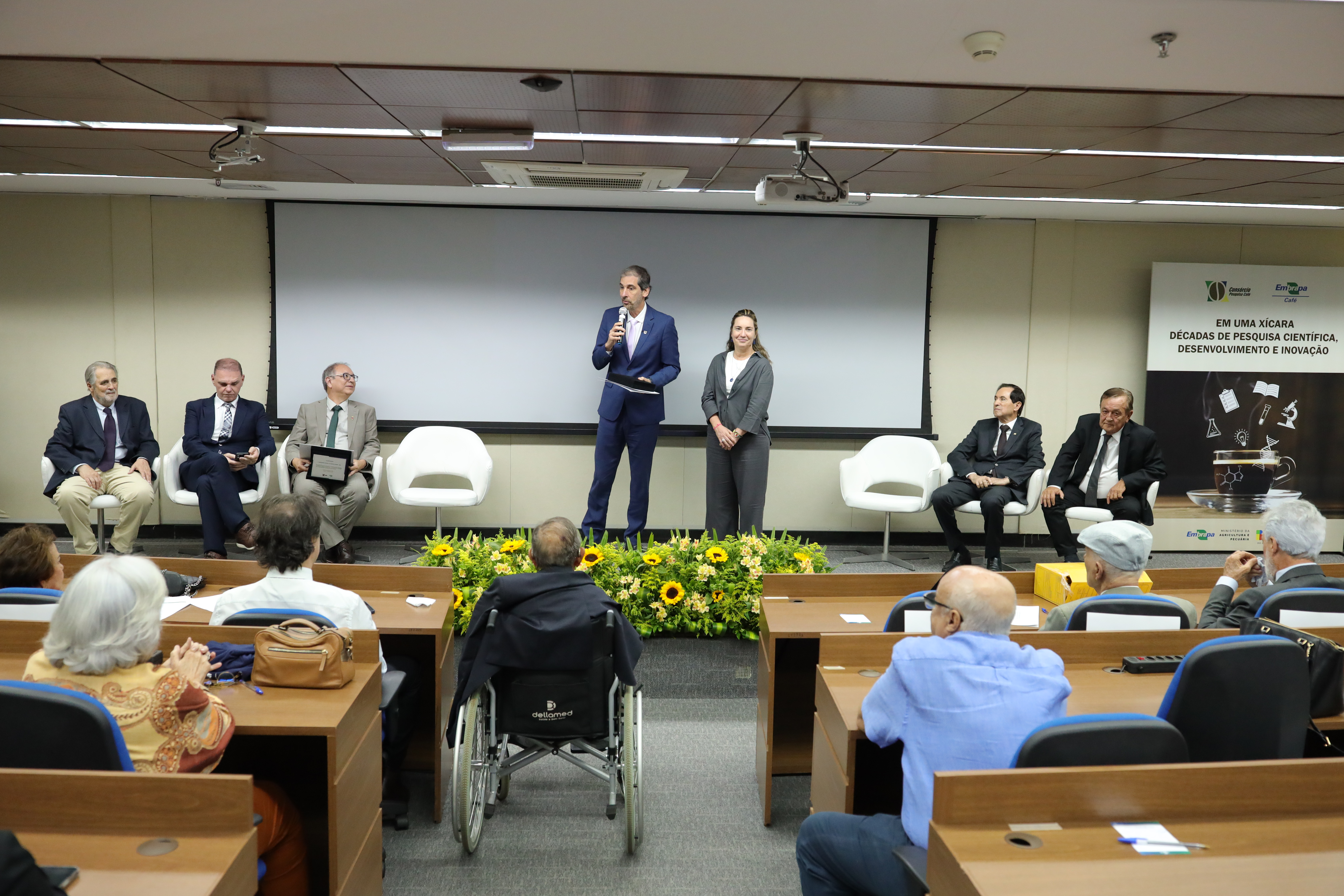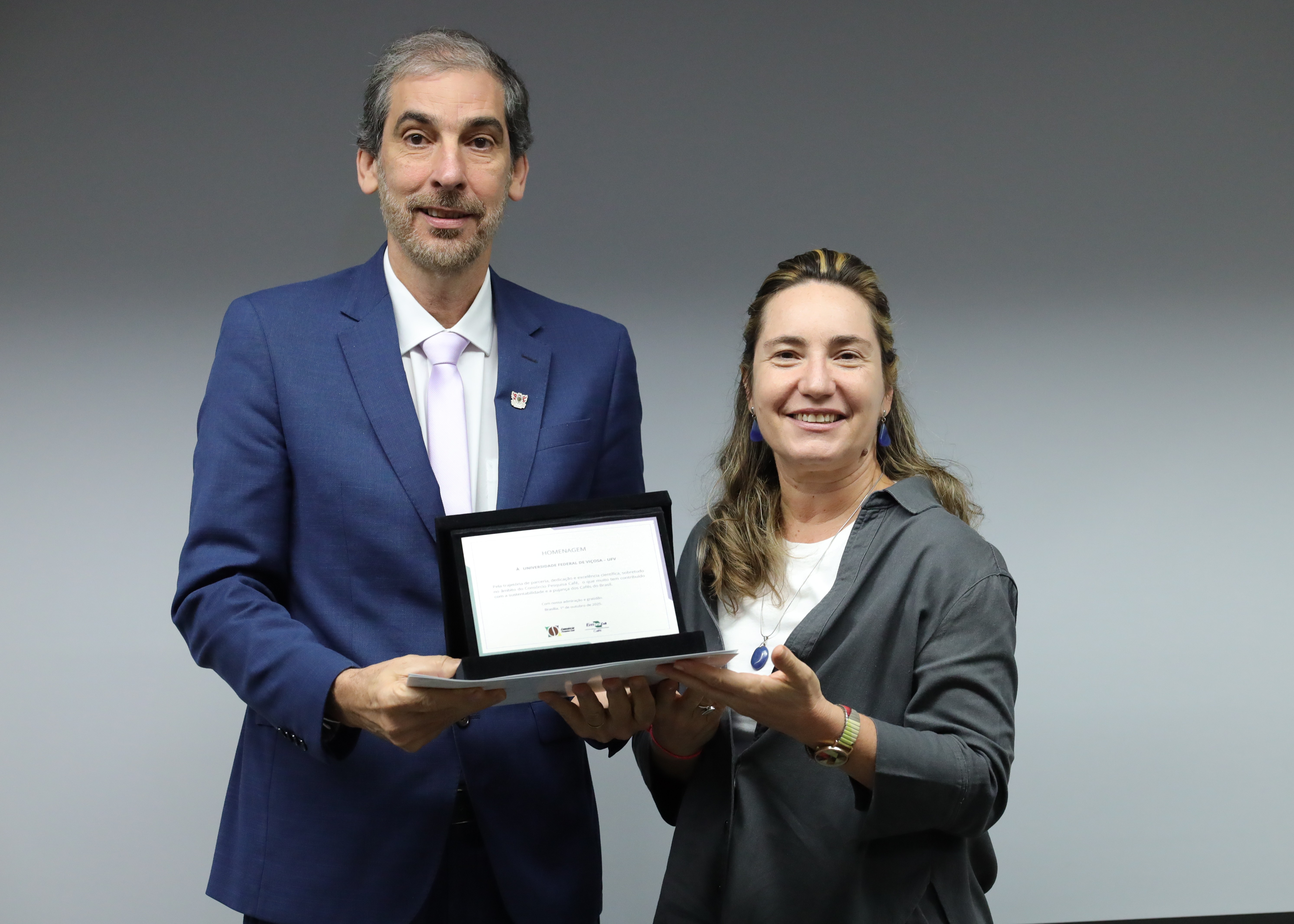 A UFV foi homenageada durante a celebração da Embrapa Café 25+ anos, realizada nessa quarta-feira (1º). O evento aconteceu na sede da Embrapa Café, em Brasília, e a Universidade foi representada pelo reitor Demetrius David da Silva, que participou da mesa de honra e recebeu a placa e o certificado das homenagens.