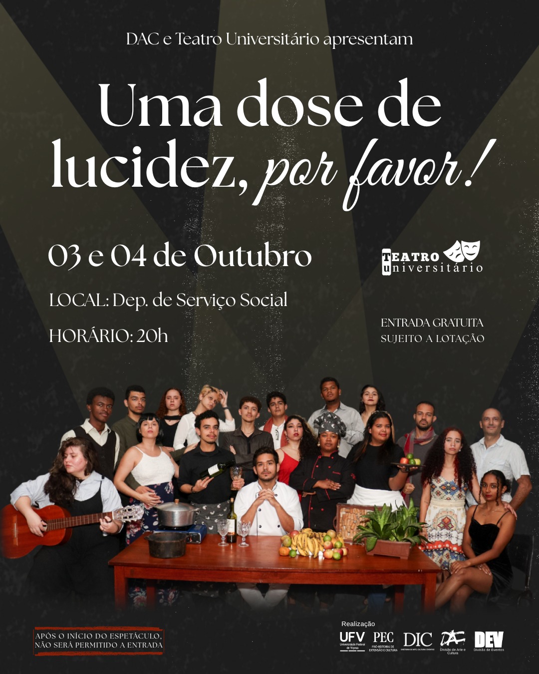 A Divisão de Arte e Cultura (DAC) e o Teatro Universitário (TU) da UFV promovem para toda a comunidade o espetáculo Uma Dose de Lucidez, por favor!. As apresentações acontecerão nesta sexta-feira (3) e no sábado (4), às 20h, no Departamento de Serviço Social (DSE). As entradas serão gratuitas, por ordem de chegada e sujeitas à lotação.