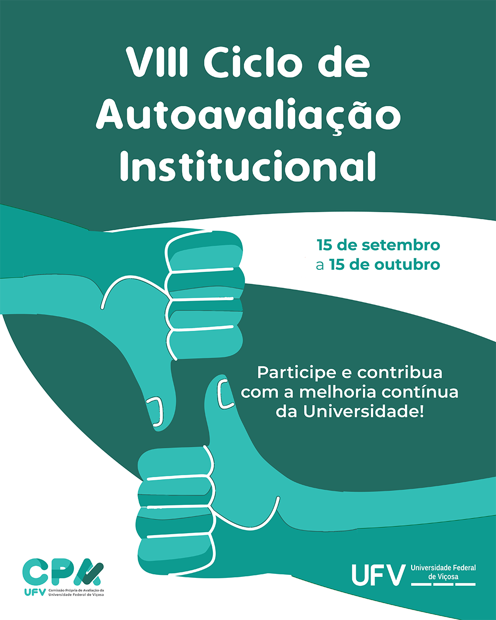 A Comissão Própria de Avaliação (CPA) lembra que todos os servidores públicos e estudantes dos três campi da UFV devem participar com a identificação dos pontos fortes e fracos da Universidade, assim como com seu planejamento e decisões para a melhoria contínua da qualidade da educação superior. O prazo final para responder ao questionário do VIII Ciclo de Autoavaliação Institucional, disponível no site da CPA, é 15 de outubro.
