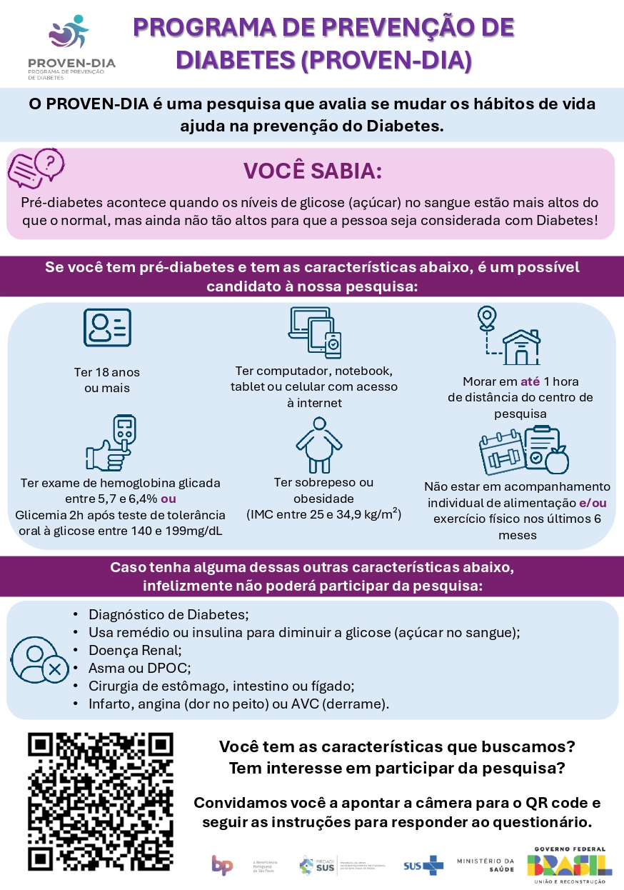Os interessados em participar devem ter mais de 18 anos, com sobrepeso ou obesidade, possuir diagnóstico médico de pré-diabetes e não ter realizado acompanhamento nutricional, nem praticado atividades físicas individualizadas, nos últimos seis meses. Os participantes serão monitorados durante três anos por nutricionistas do projeto. Nesse acompanhamento, serão realizadas orientações para mudanças do estilo de vida e prescritos dois tipos de dietas para prevenir o diabetes, com acompanhamento nutricional individualizado e realização de exames bioquímicos, sem custos.