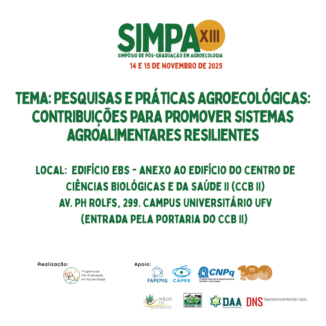 Pesquisas e Práticas Agroecológicas: contribuições para promover sistemas agroalimentares resilientes é o tema do XIII Simpósio de Pós-Graduação em Agroecologia (Simpa), que será realizado nos dias 14 e 15 de novembro, no campus Viçosa.