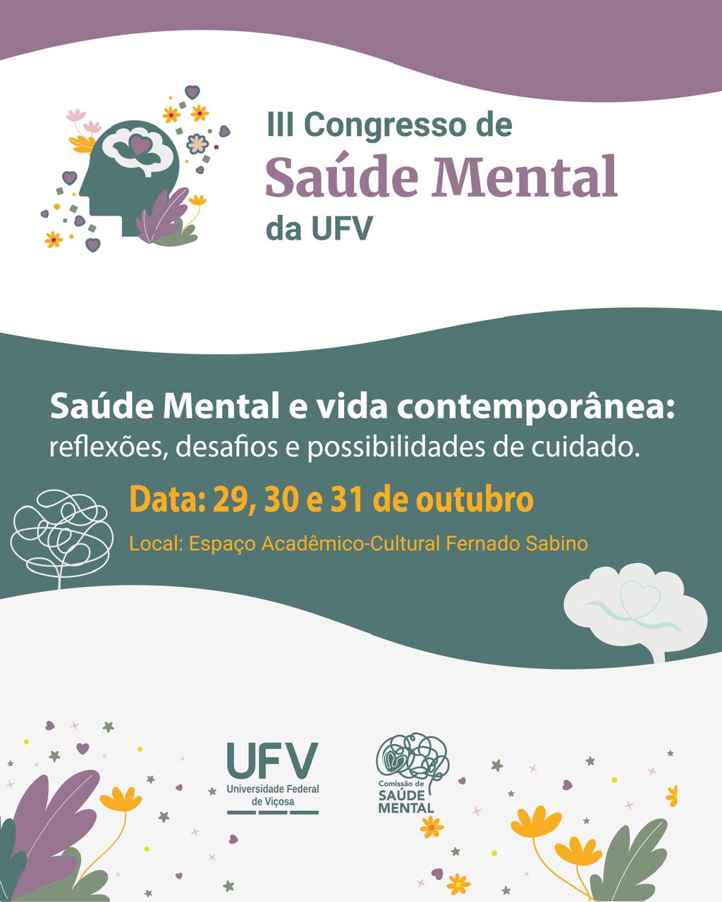 Estão abertas, até o dia 27, as inscrições para o III Congresso de Saúde Mental da UFV. O evento será realizado entre os dias 29 e 31 de outubro, no Espaço Acadêmico-Cultural Fernando Sabino, para debater as demandas e desafios da saúde mental na contemporaneidade.