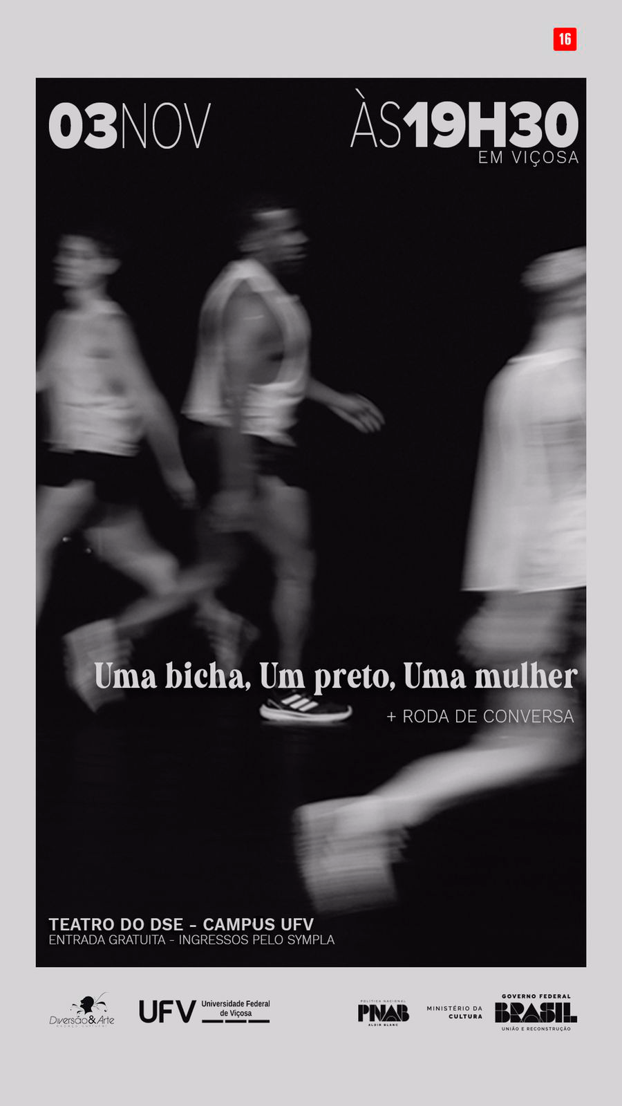 O campus Viçosa da UFV receberá, na segunda-feira (3), o espetáculo Uma Bicha, Um Preto, Uma Mulher — contemplado pela Política Nacional Aldir Blanc de Fomento à Cultura. Ele será apresentado às 19h30, no Teatro do Departamento de Serviço Social. Os interessados devem retirar os ingressos gratuitamente; o evento não é recomendado para menores de 16 anos de idade.