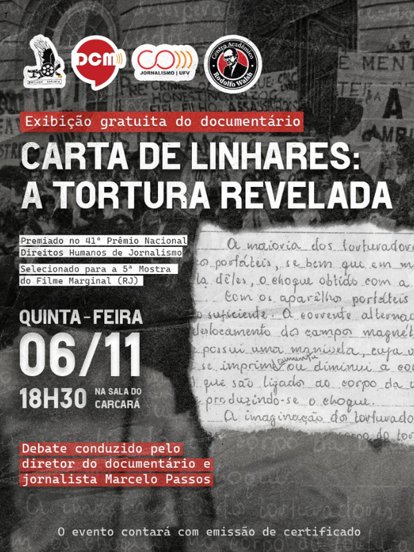 O Cineclube Carcará exibirá gratuitamente, nesta quinta-feira (6), às 18h30, o documentário Carta de Linhares: a tortura revelada. Após a exibição, haverá um debate com o jornalista Marcelo Passos, roteirista e diretor do filme, que aborda o primeiro documento público de denúncia internacional da prática de tortura pelo regime militar no Brasil. A exibição tem a parceria do Departamento de Comunicação Social da UFV e do Centro Acadêmico Rodolfo Walsh. Haverá emissão de certificado.