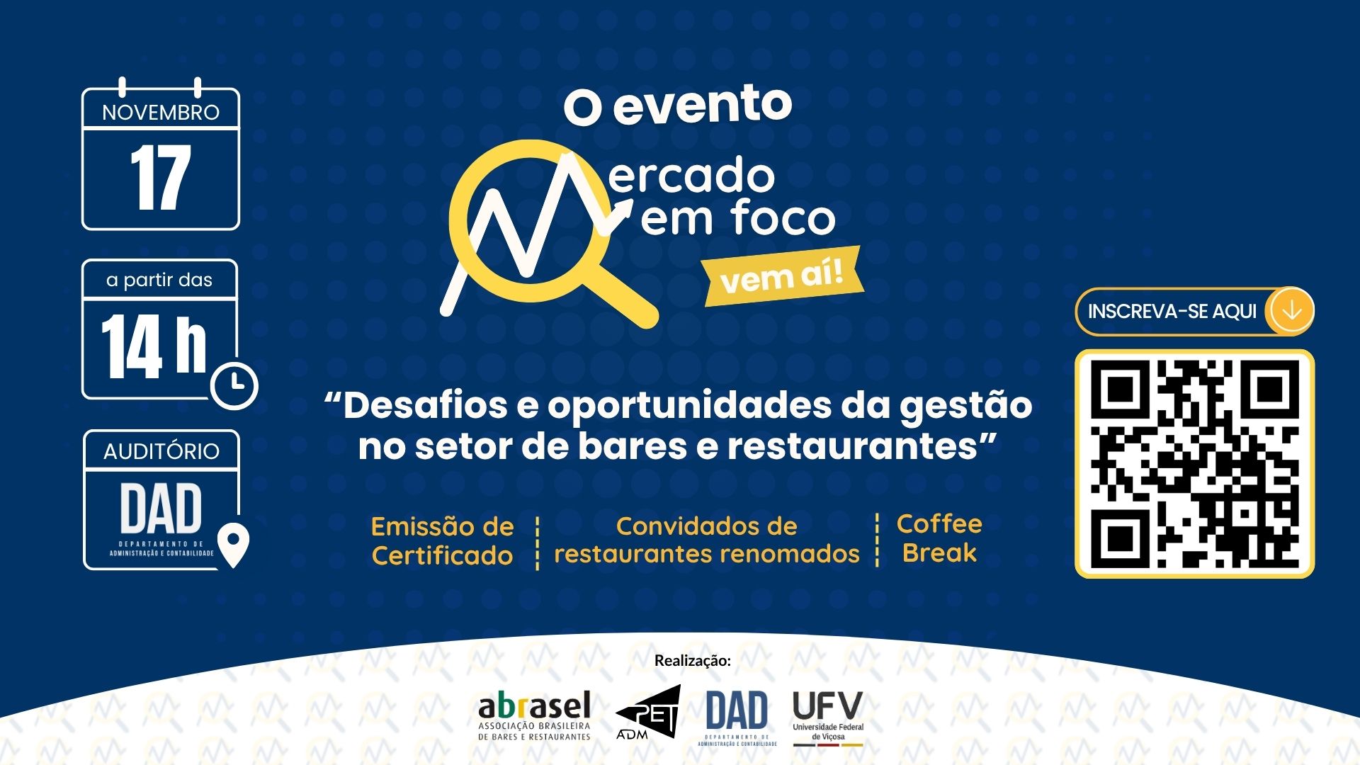 Com o objetivo de discutir desafios e oportunidades de gestão no setor de bares e restaurantes, o Programa de Educação Tutorial em Administração (PET ADM) promoverá o evento Mercado em Foco na próxima segunda-feira (17). A atividade acontecerá a partir das 14h, no auditório do Departamento de Administração e Contabilidade, no campus Viçosa da UFV, direcionada para estudantes — principalmente de Administração — e empreendedores de Viçosa e região. Para participar é necessário realizar inscrição.
