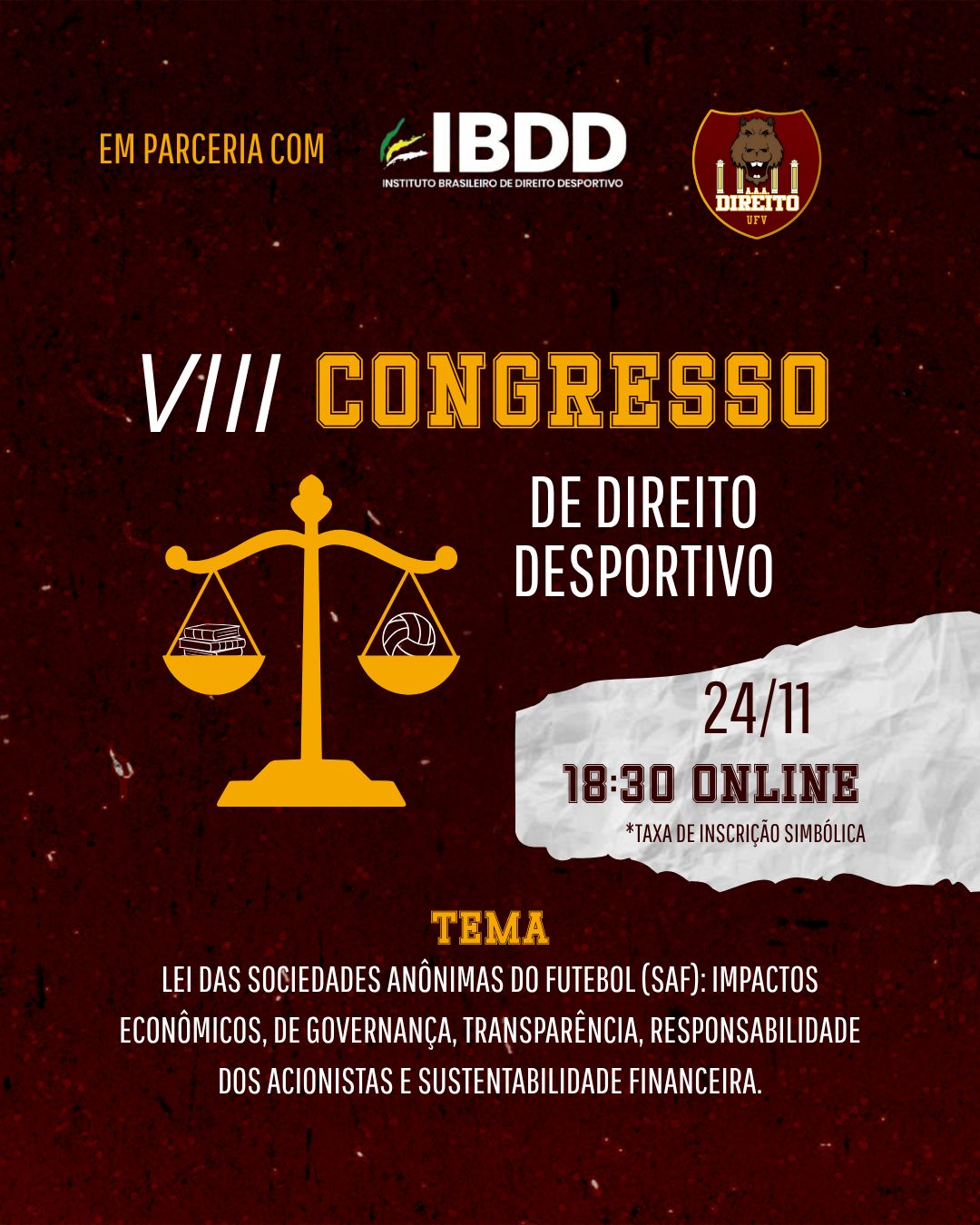 Com o tema Lei das Sociedades Anônimas do Futebol (SAF): impactos econômicos, de governança, transparência, responsabilidade dos acionistas e sustentabilidade financeira, na próxima segunda-feira (24), às 18h30, acontecerá o VIII Congresso de Direito Desportivo. Organizado pela Associação Atlética Acadêmica do Direito da UFV, com a parceria do Instituto Brasileiro de Direito Desportivo (IBDD), o evento será on-line e aberto a todos os públicos.