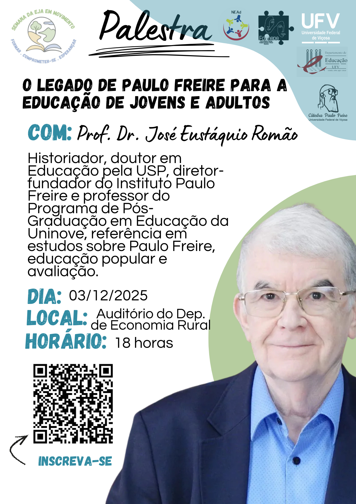 No dia 3 de dezembro, a partir das 18h, o auditório do Departamento de Economia Rural (DER) receberá a palestra O legado de Paulo Freire para a Educação de Jovens e Adultos, que será proferida pelo professor convidado José Eustáquio Romão, fundador do Instituto Paulo Freire, de São Paulo. Podem participar licenciandos, professores da educação básica, professores universitários das licenciaturas, bem como toda a comunidade viçosense.