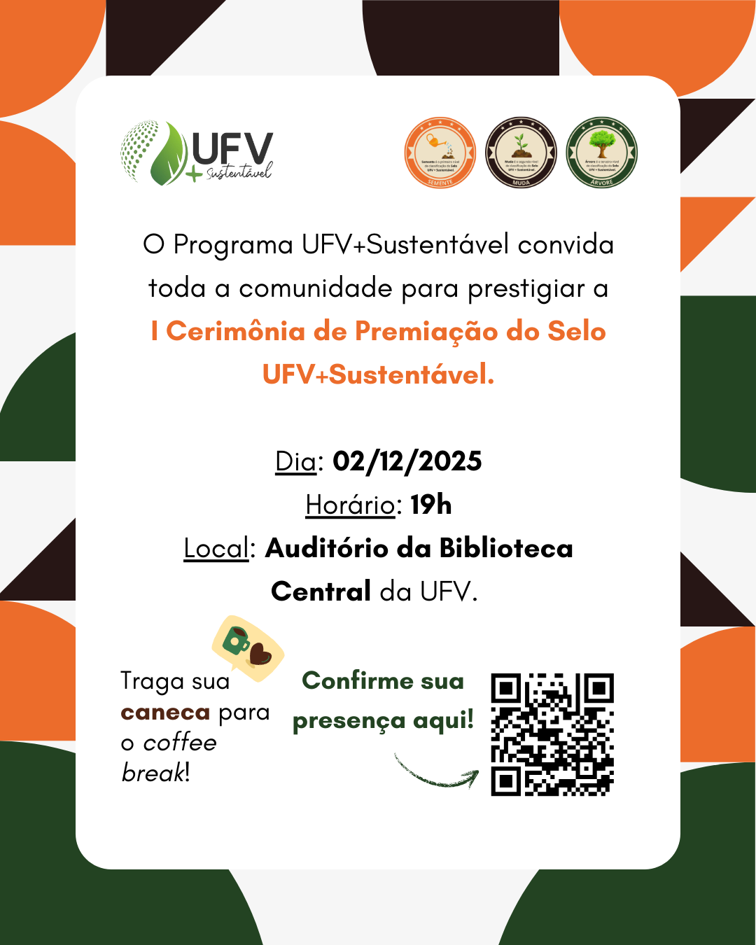 O Programa UFV+Sustentável e a Diretoria de Meio Ambiente promoverão, nesta terça-feira (2), a I Cerimônia de Premiação do Selo UFV+Sustentável. O evento, aberto a toda a comunidade acadêmica, acontecerá às 19h, no auditório da Biblioteca Central, do campus Viçosa.