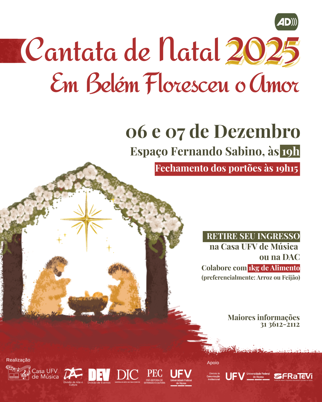 A Cantata de Natal 2025 – Em Belém Floresceu o Amor é uma realização da Casa UFV de Música e da Divisão de Arte e Cultura (DAC), vinculadas à Pró-reitoria de Extensão e Cultura (PEC). Conta ainda com o apoio da Fratevi e da Diretoria de Comunicação Institucional (DCI).