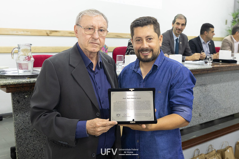 Professores e técnicos foram reconhecidos pelo comprometimento e dedicação ao Departamento de Estatística, especialmente o professor Paulo Cecon (à esq., na foto ao lado), “como representante de todos os docentes, decano do DET e referência institucional pelo conjunto de sua trajetória e contribuições”.