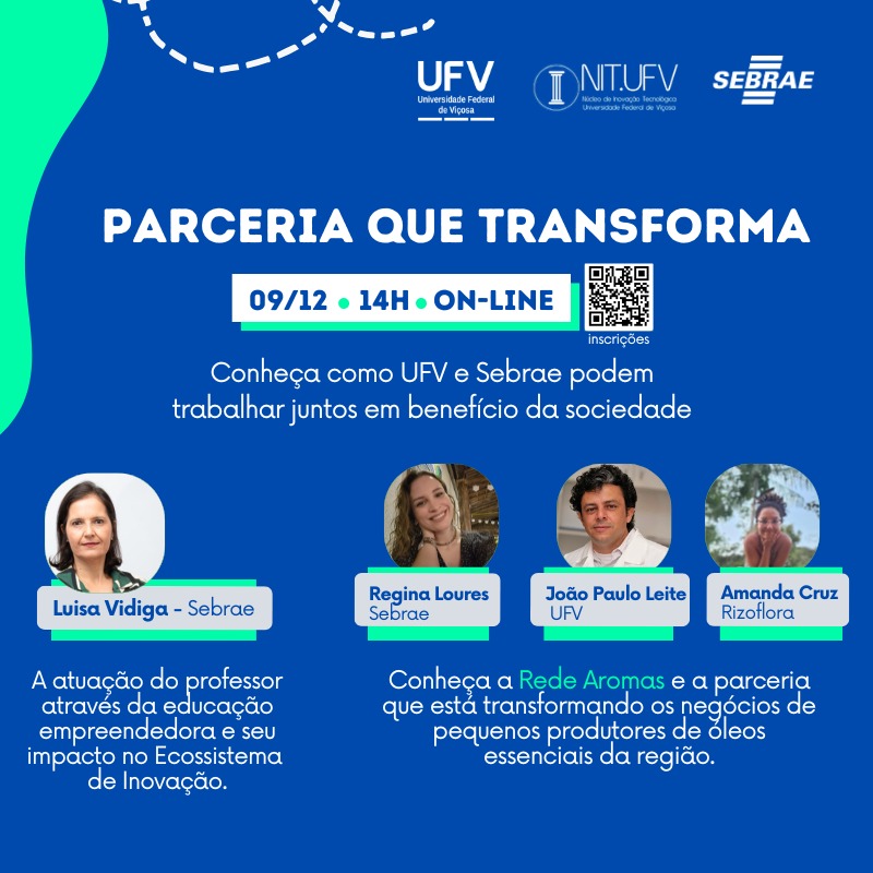 O Núcleo de Inovação Tecnológica (NIT) da UFV, em parceria com o Sebrae, realizará, na próxima terça-feira (9), às 14h, o encontro on-line Parceria que Transforma. O evento tem como objetivo apresentar cases e oportunidades de colaboração entre a academia e o ecossistema de inovação e empreendedorismo, mostrando como a atuação docente e a pesquisa podem gerar impacto social e econômico.