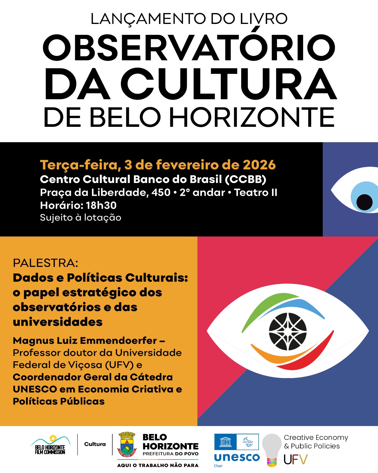 O professor Magnus Luiz Emmendoerfer, do Departamento de Administração e Contabilidade, lançará o livro Observatório da Cultura de Belo Horizonte, na próxima terça-feira (3), às 18h30, no Centro Cultural do Banco do Brasil (CCBB), da capital mineira. A obra é fruto de uma parceria de três anos entre a UFV, por meio do Programa de Pós-graduação em Administração Pública (PPGAdm), a Cátedra Unesco em Economia Criativa e Políticas Públicas, e a Secretaria Municipal de Cultura de Belo Horizonte.