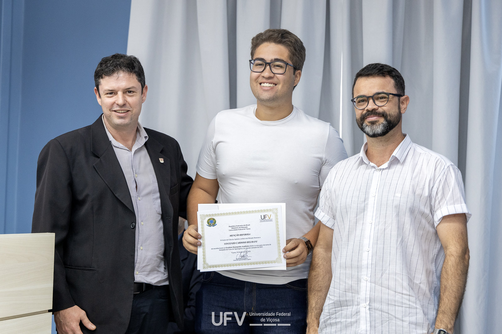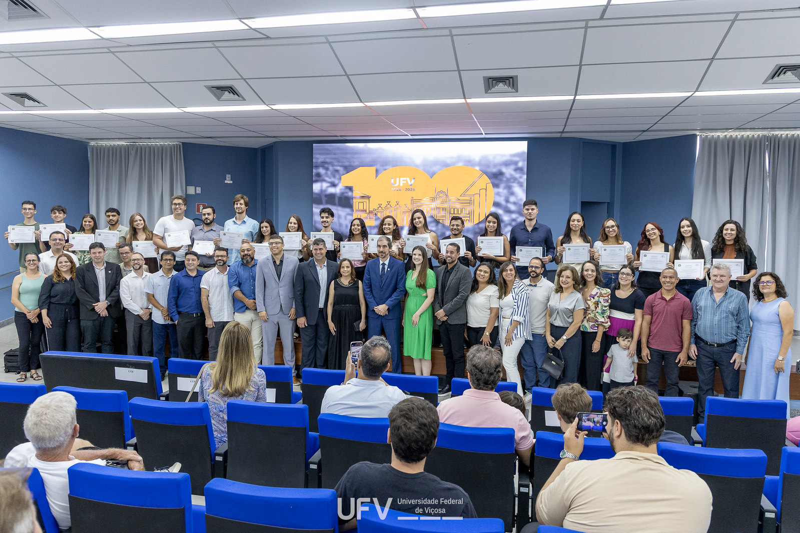 Além do diploma e das lembranças do tempo de graduação, alguns estudantes da turma Formandos do Centenário levarão da UFV um item a mais em sua bagagem acadêmica: uma menção honrosa por terem se destacado em seus cursos. A entrega aconteceu na manhã desta sexta-feira (30), no auditório da Biblioteca Central do campus Viçosa. Ali estavam 22 formandos do Centro de Ciências Agrárias (CCA) e do Centro de Ciências Exatas e Tecnológicas (CCE), esses responsáveis pela homenagem. Os dois centros foram representados na cerimônia pelos seus diretores, Mário Luiz Chizzotti (CCA) e Danielle Dias Sant’Anna Martins (CCE).