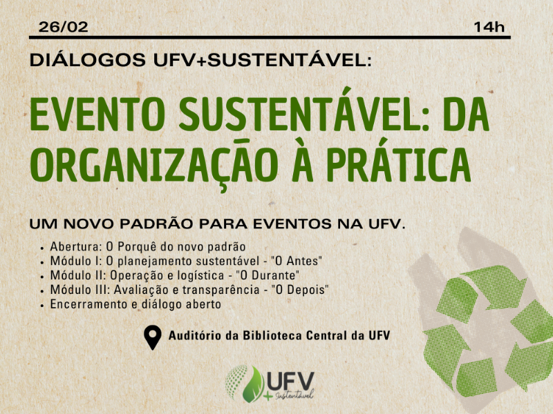 O Programa UFV+Sustentável, da Diretoria de Meio Ambiente (DAM), realizará, nesta quinta-feira (26), um evento que propõe uma reflexão prática e estratégica sobre a realização de eventos mais sustentáveis na universidade. Aberto a toda a comunidade acadêmica, o Diálogos UFV+Sustentável: Evento Sustentável – Da organização à prática: Um novo padrão para eventos UFV acontecerá, às 14h, no auditório da Biblioteca Central, no campus Viçosa.