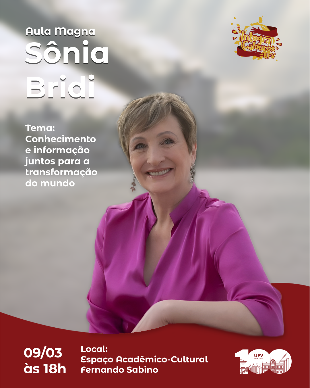 O tema da Aula Magna — Conhecimento e informação juntos para a transformação do mundo — propõe uma interseção das trajetórias da UFV e da convidada, que têm em comum a democratização do saber. O objetivo é inspirar debates sobre assuntos da atualidade e seus desdobramentos no futuro, motivando principalmente os estudantes de graduação em suas formações e aspirações profissionais.
